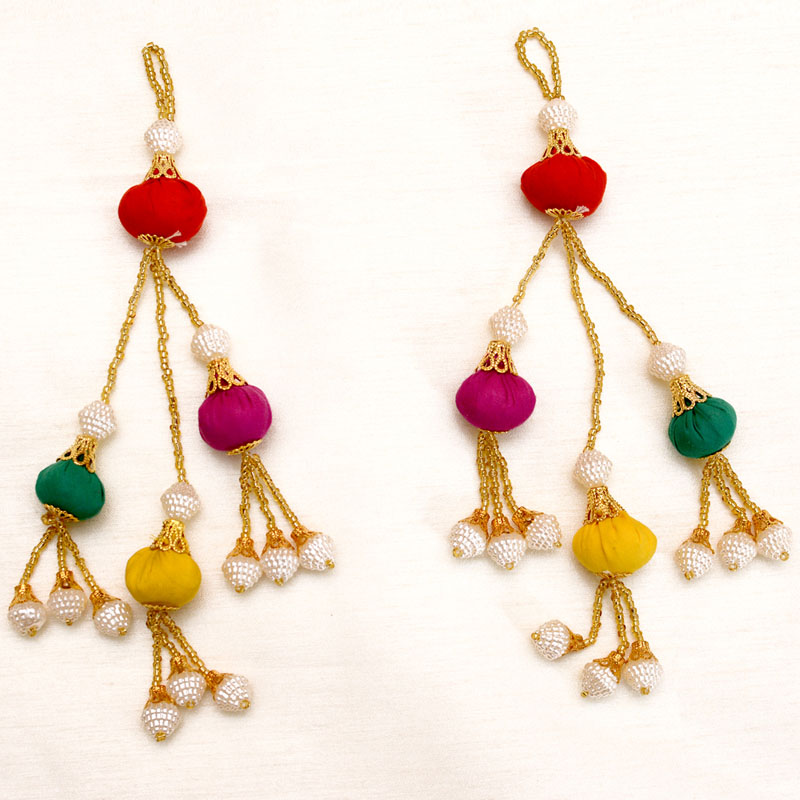 2 Decorative Handmade Multicolor Pom Pom Hanging Latkans-0040A Pair of Handmade Pom Pom Tassel. It is made with Pearl work.These beautiful Latkan/Tassels can be used for: