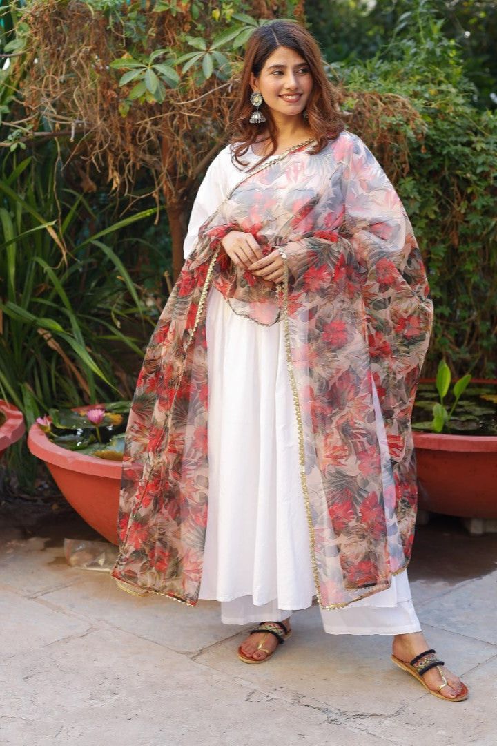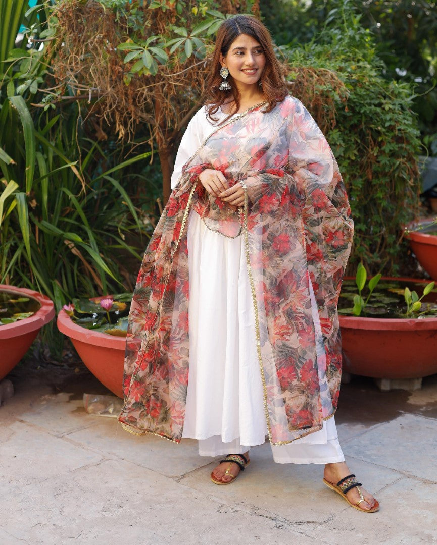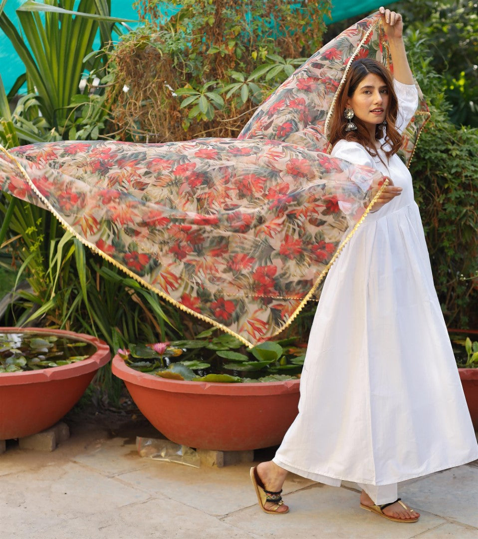- This designer dupatta has been beautifully handcrafted with gota work on organza fabric. Transparent and Light Weighted Dupatta.- Organza Dupatta Floral Gota Patti on Border 2.5 Meter is an exquisite piece of fabric that is perfect for women's ethnic wear. This dupatta is made from high-quality organza fabric, which is known for its sheer and lightweight texture. The gota patti work on the border adds a touch of elegance and sophistication, making it a perfect accessory for any traditional outfit.