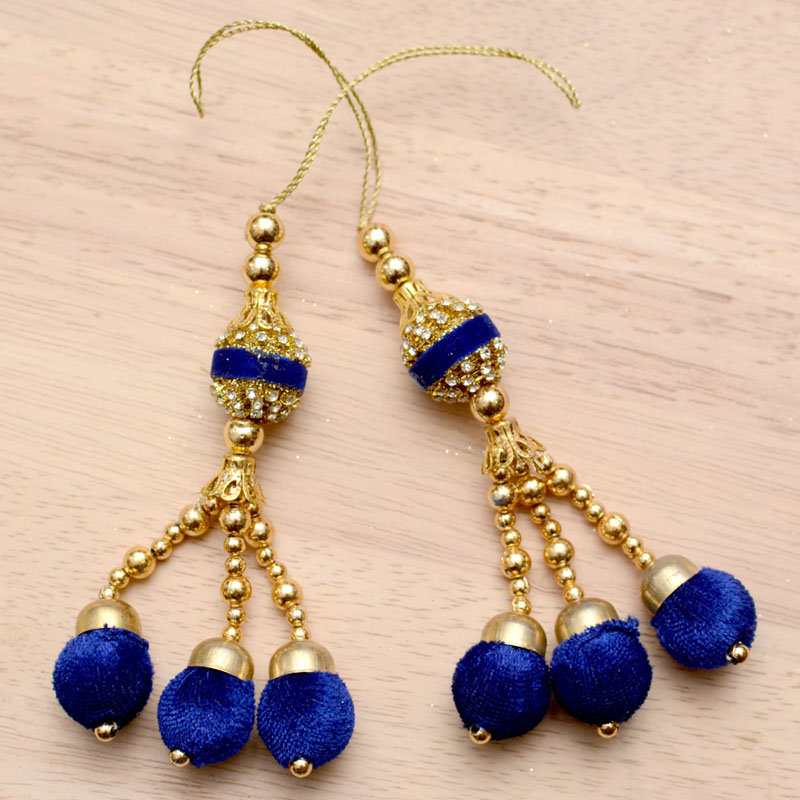 2 Golden Handmade Blue Pom Pom Latkans with White Stones-0020A Pair of Pearl Tassle. It is made with Pearl work.These beautiful Latkan/Tassels can be used for: