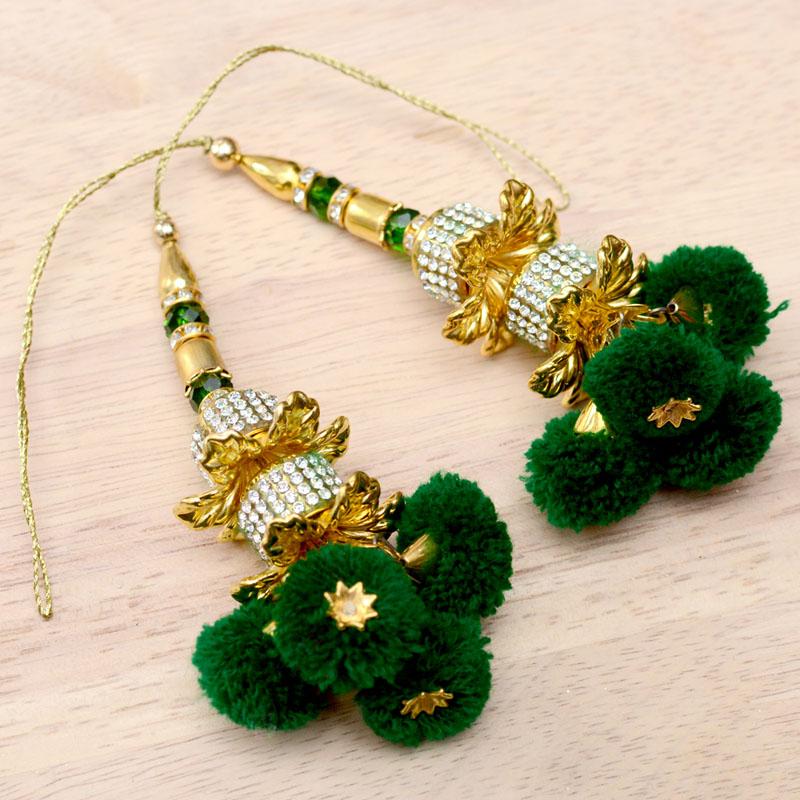 2 Golden Handmade Decorative Dark Green Pom Pom Latkans-0039A Pair of Handmade Pom Pom Tassel. It is made with Thread work.These beautiful Latkan/Tassels can be used for: