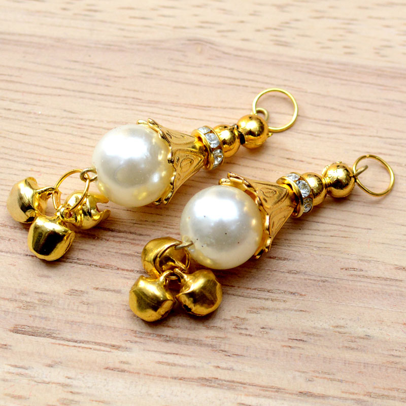 2 Golden Handmade Decorative Hanging Bells Small Latkans-0059A Pair of Handmade Pom Pom and Pearl Tassel. It is made with Pearl work.These beautiful Latkan/Tassels can be used for: