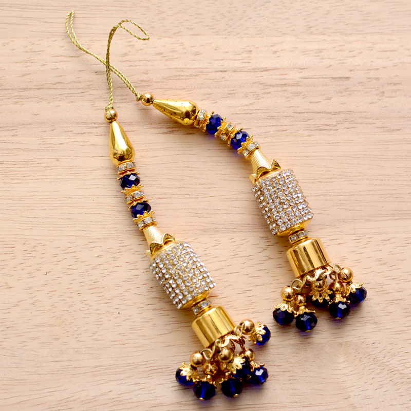 2 Golden Handmade Decorative Latkans with Blue Stones-0023A Pair of Pearl Tassle. It is made with Pearl work.These beautiful Latkan/Tassels can be used for: