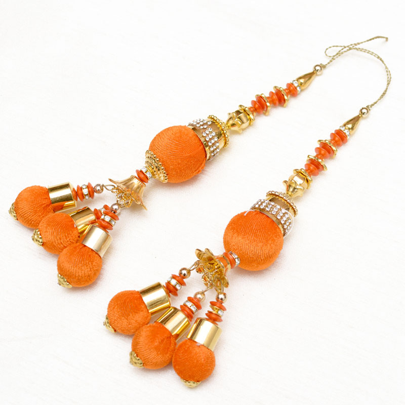 2 Golden Handmade Decorative Latkans with Orange Pom Pom-0049A Pair of Handmade Thread Latkan. It is made with Thread work.These beautiful Latkan/Tassels can be used for: