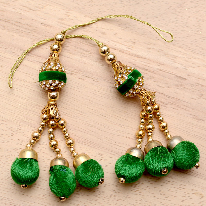 2 Golden Handmade Green Pom Pom Latkans with Gold pearls-0019A Pair of Pearl Tassle. It is made with Pearl work.These beautiful Latkan/Tassels can be used for: