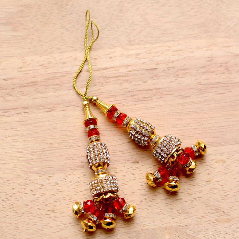 2 Golden Handmade Latkans with Gold Hanging Beaded-0024A Pair of Pearl Tassle. It is made with Pearl work.These beautiful Latkan/Tassels can be used for: