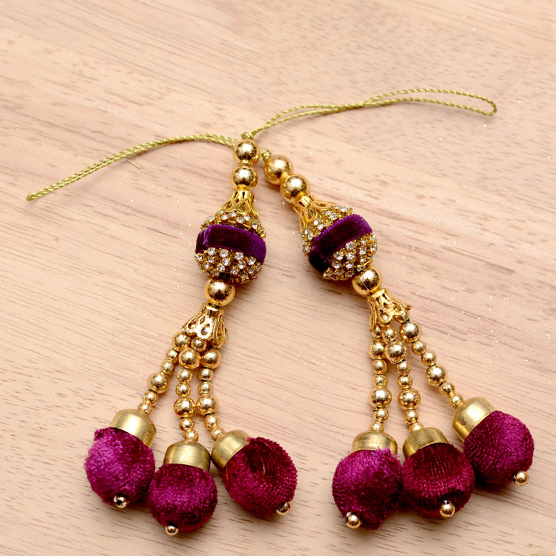 2 Golden Handmade Maroon Pom Pom Latkans with Gold pearls-0021A Pair of Pearl Tassle. It is made with Pearl work.These beautiful Latkan/Tassels can be used for: