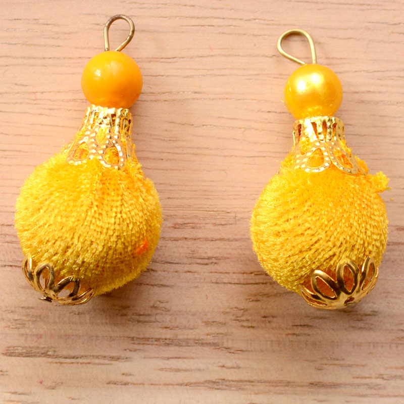 2 Handmade Pom Pom Decorative Latkans with Yellow Pearls-0070A Pair of Handmade Pom Pom and Pearl Tassel. It is made with Pearl work.These beautiful Latkan/Tassels can be used for: