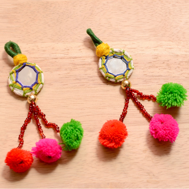 2 Multicolor Handmade Pom Pom Latkans with Mirror-0002A Pair of Pom pom Tassle with Mirror. It is made with Mirror work.These beautiful Latkan/Tassels can be used for: