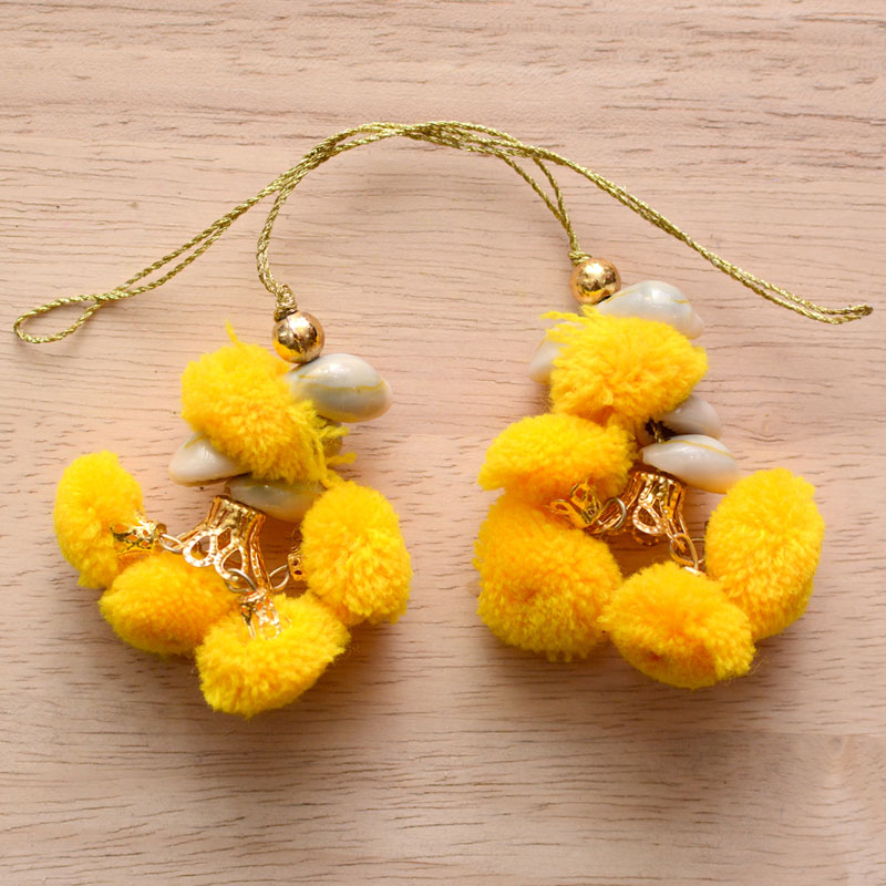 2 Yellow Handmade Decorative Pom Pom Latkans by the yard-0026A Pair of Handmade Decorative Pom Pom Latkan. It is made with Thread work.These beautiful Latkan/Tassels can be used for: